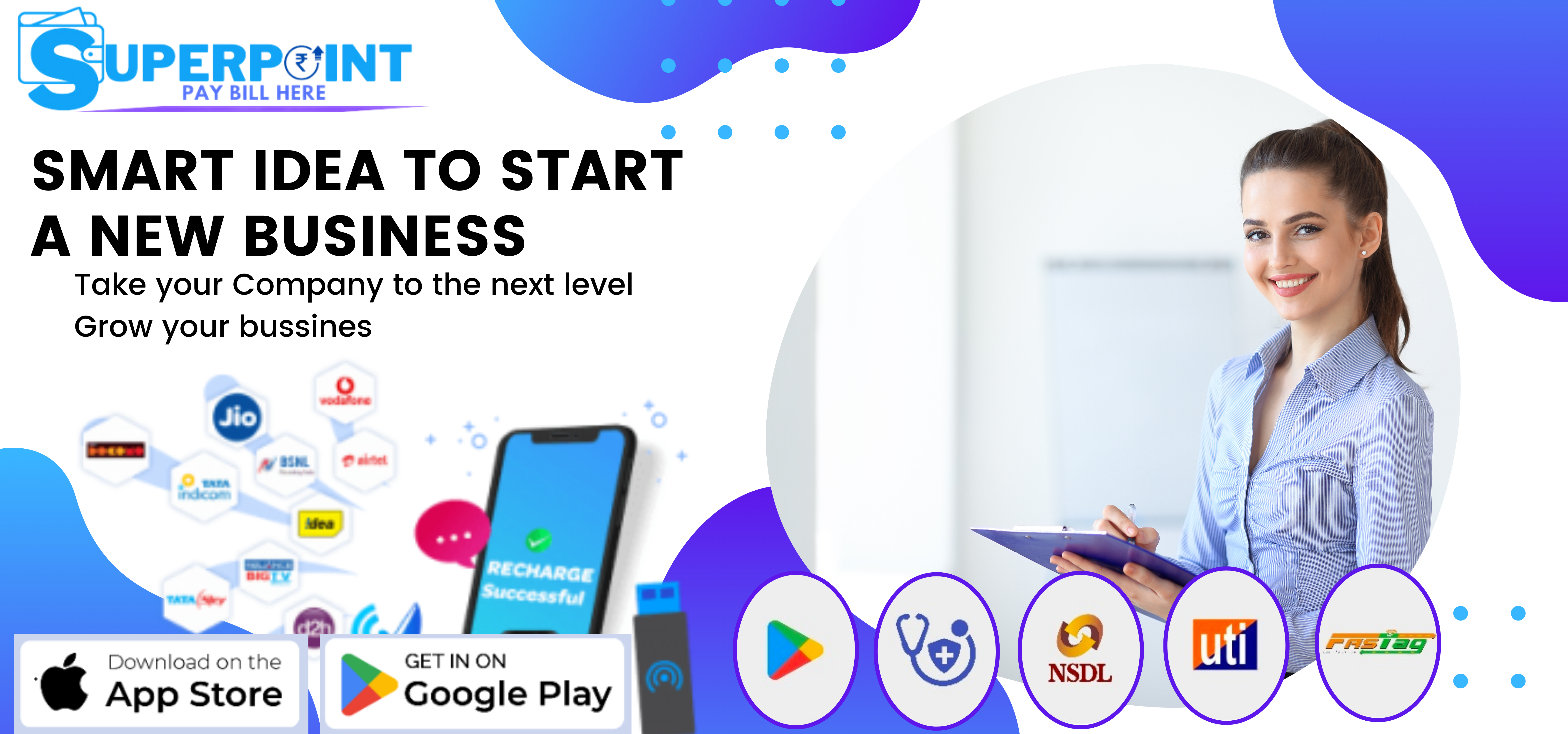 We at Bill Points provide Recharge (Mobile, Dth, Data Card), Bill Payment System (Electricity, Landline, Mobile Bill Payment), Aadhaar Enabled Payment System (AEPS), Domestic Money Transfer, Pan Card (Nsdl), Travel Ticket Booking ( Bus, Hotel, Flight) mPOS Machine.